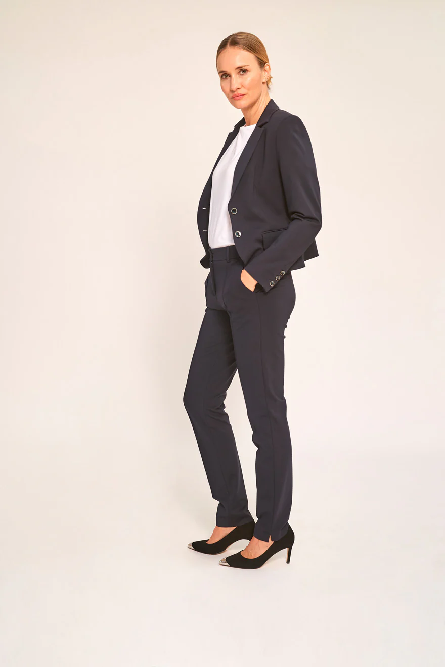 Klassiset housut, joissa suorat lahkeet ja tasku edessä. Lahkeensuissa sivuilla pienet halkiot. Valmistettu joustavasta kankaasta.