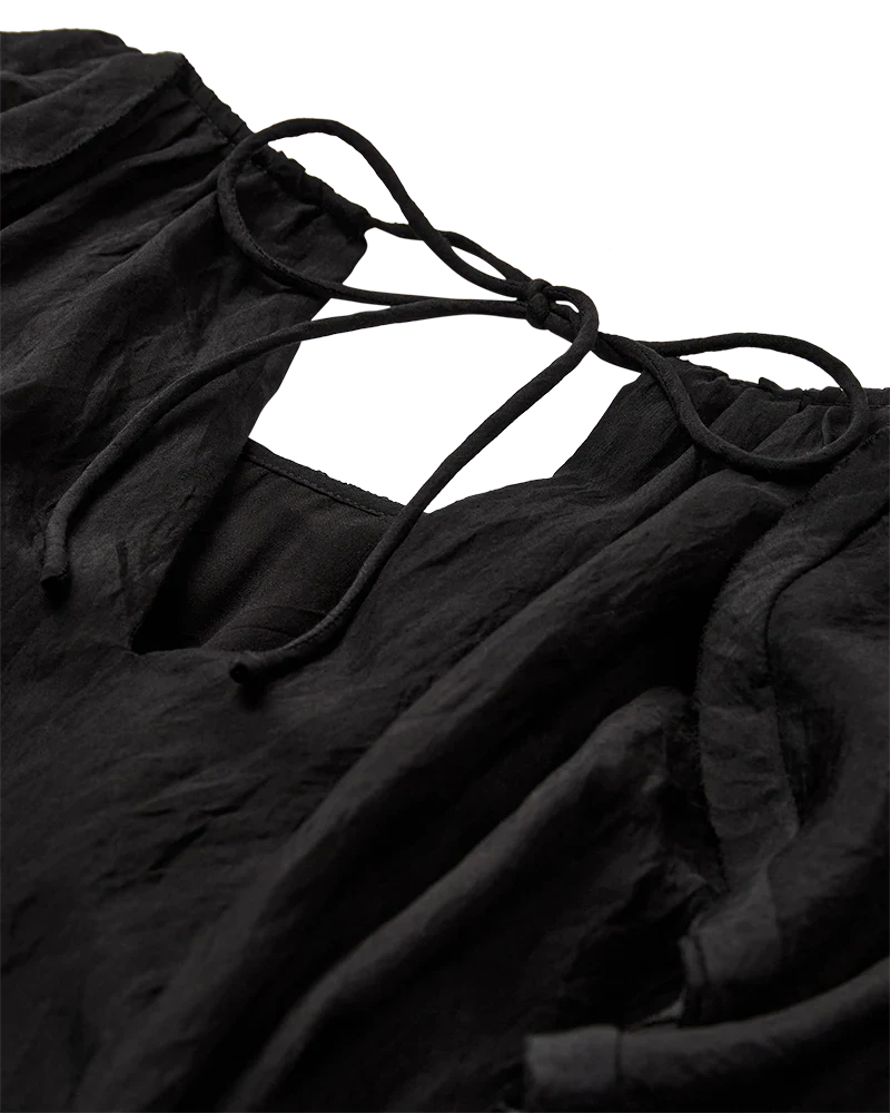 Copenhagen Muse NORMA DRESS on lyhyt mekko laadukkaasta, hieman läpikuultavasta materiaalista. Mekko on kokonaan vuorattu ja siinä on halkio sekä nauhakiinnitys niskassa. Pitkät, leveät hihat saa säädettyä kiristysnyörillä. Mekko on loose fit -mallia, eli väljähkö ja mukava päällä.