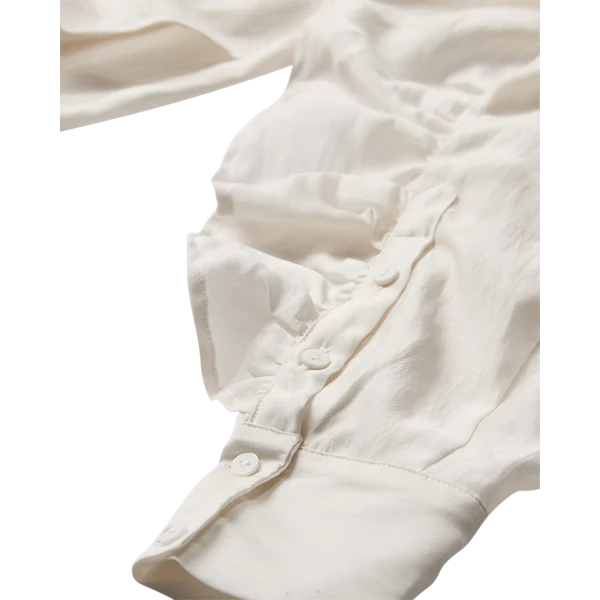 CMMOLLY-PAITA on ensiluokkaisesta materiaalista valmistettu paita, jossa on piilonapitus edessä, siro kaulus ja pitkät hihat, joissa on elegantit, suuret röyhelöt.