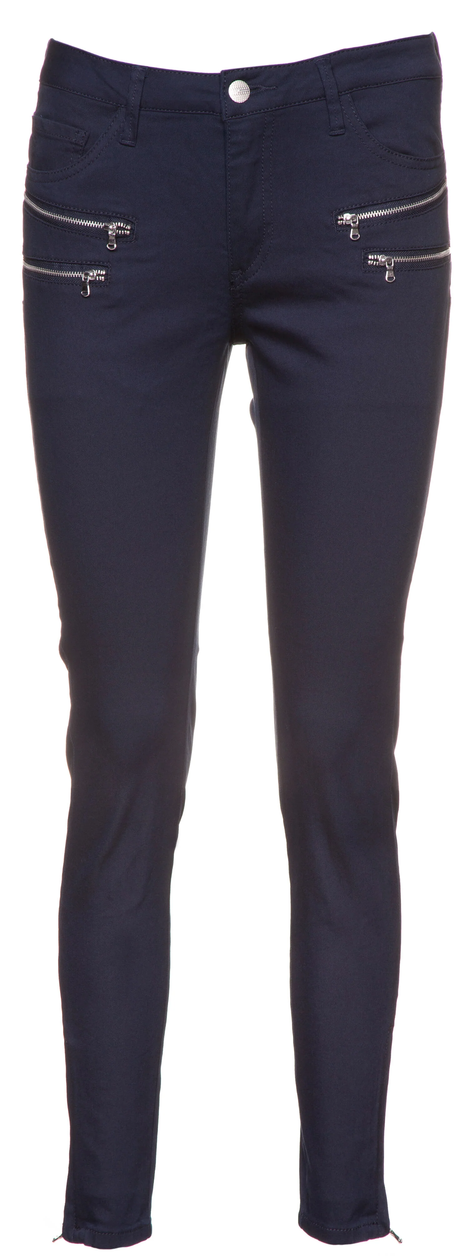 Freequentin huolettomat, kapeat housut 7/8-lahkeilla. Normaali vyötärönkorkeus, edessä hopeanvärisiä koristevetoketjuja. Lahkeensuissa lyhyet vetoketjut.