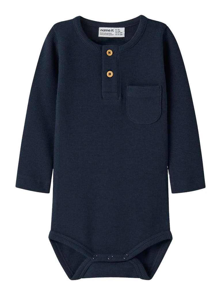 Bodyssa on pyöreä pääntie, pitkät hihat ja käytännöllinen puolinapitus edessä, joka helpottaa pukemista. Haarassa olevat painonapit tekevät vaipanvaihdosta vaivatonta. Rintatasku tuo asuun pienen, tyylikkään yksityiskohdan.