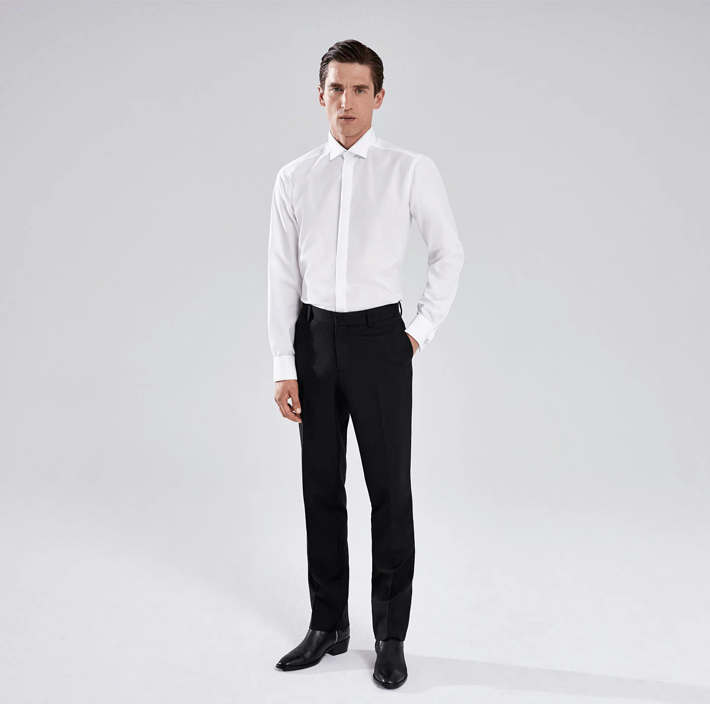 Tyylikkäät elementit kuten ranskalaiset hihansuut, siipikaulus ja piilotetut napit tekevät tästä paidasta ainutlaatuisen.