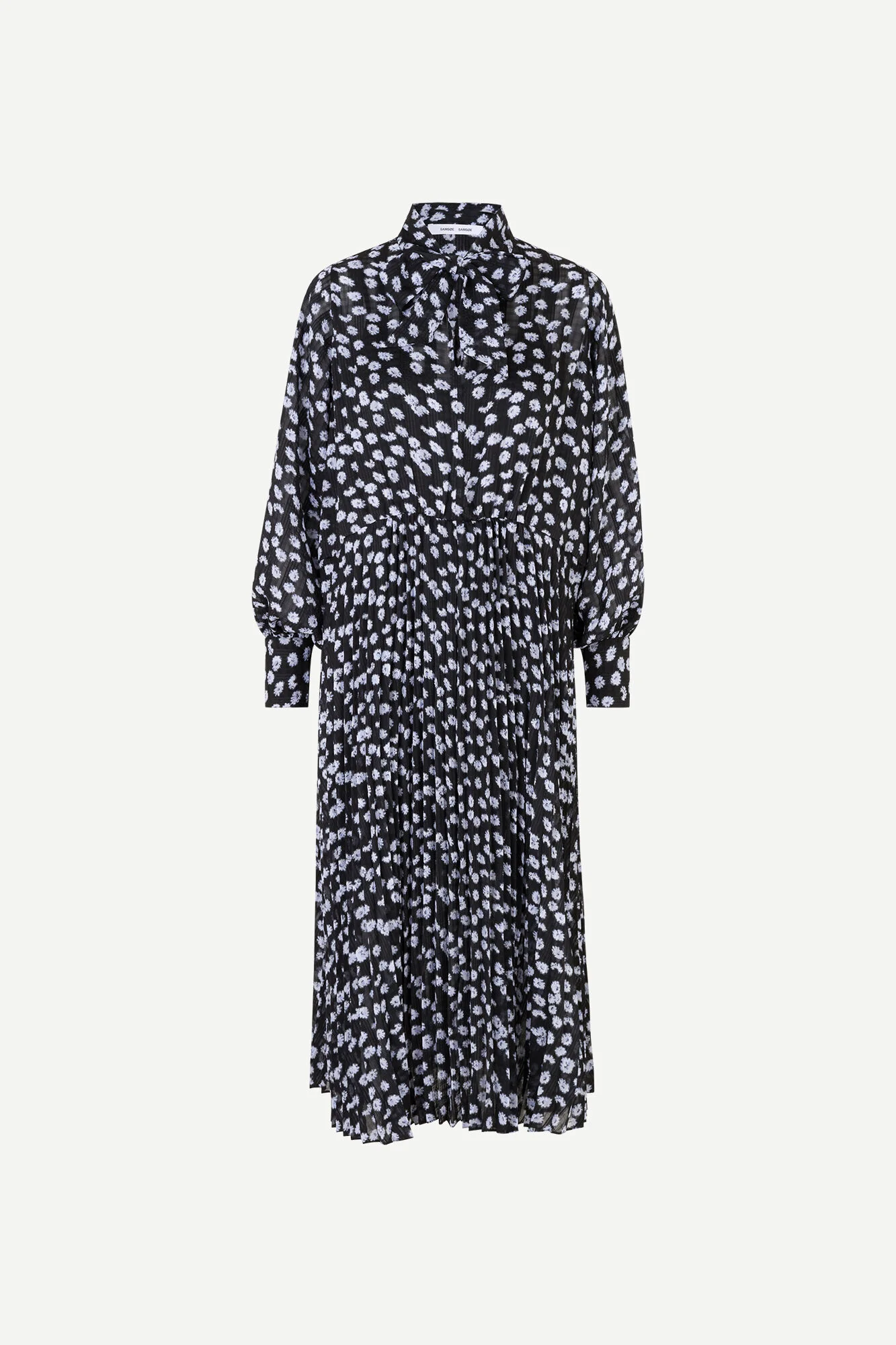 Naisten midimittainen mekko. Mekossa solmittava kaulus ja halkio. Mekossa pitkät hihat, joissa nappikiinnitys hihansuissa.