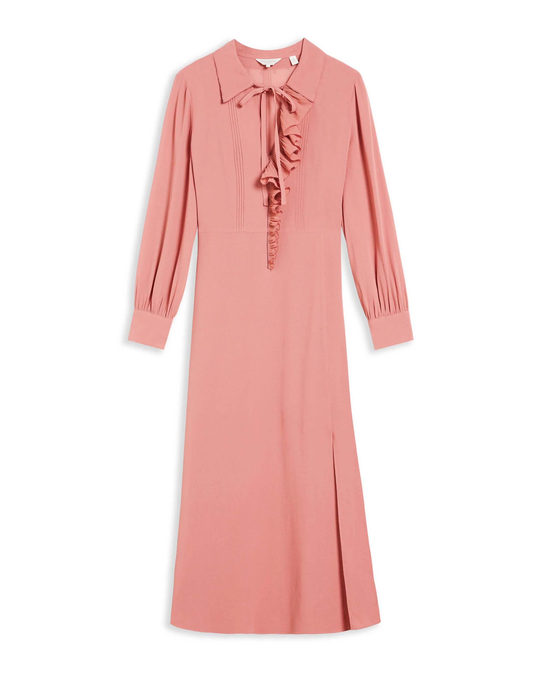 Ted Bakerin elegantissa mekossa on kauniisti laskeutuva materiaali sekä tarkkaan harkitut yksityiskohdat. Mekossa on pitkät hihat sekä midimittainen helma halkiolla. V-pääntiellä on kääntökaulus, eteen solmittavat nauhat sekä kaunis epäsymmetrinen röyhelö edessä. Pitkien hihojen malli on hieman pussimainen. Mekon materiaali on kauniisti laskeutuvaa ja keveää viskoosi.